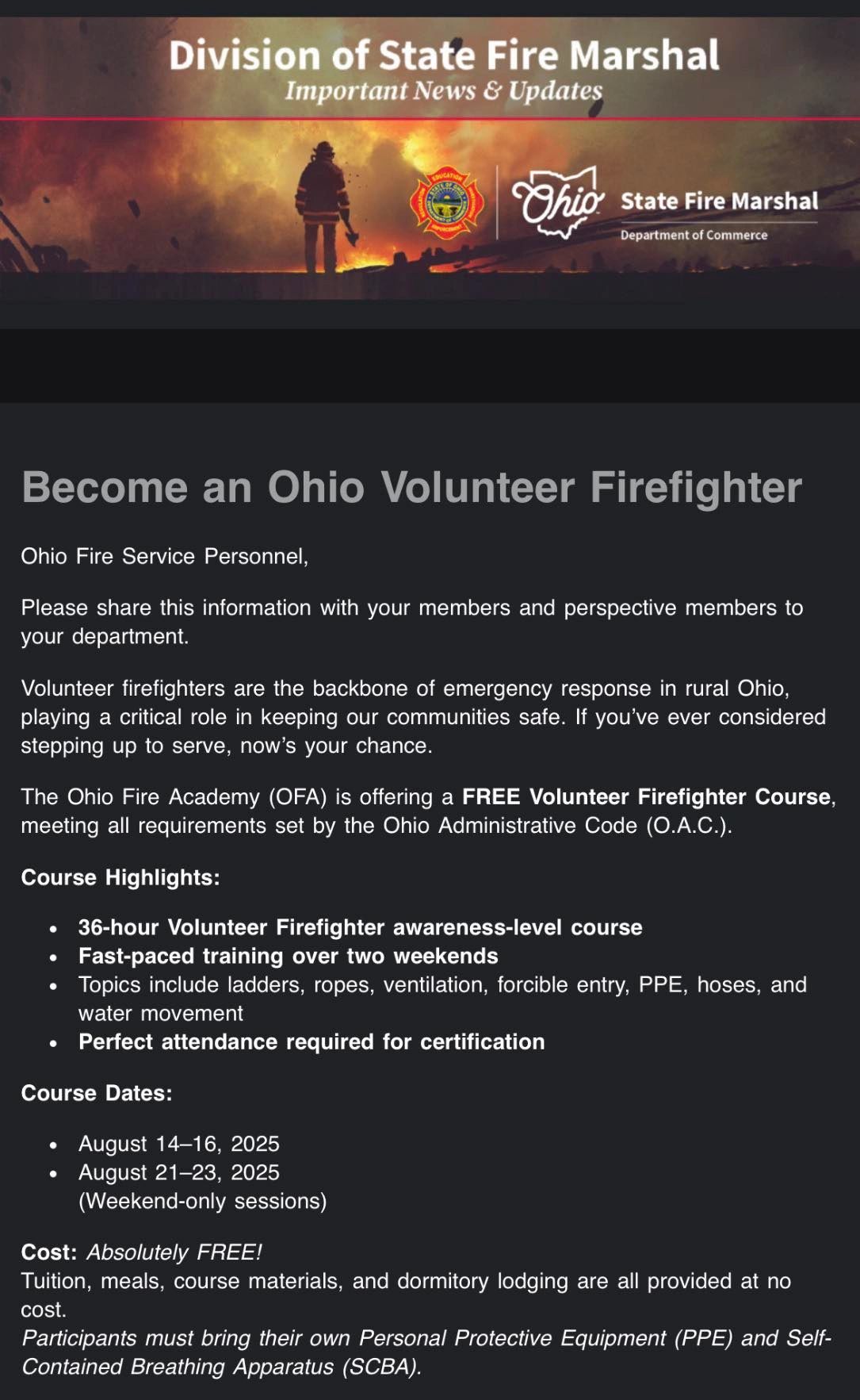 The state now offers free training for volunteer departments so individuals can get the necessary 36-hour training required to become a volunteer firefighter without the potential cost of $500 to $1,000.